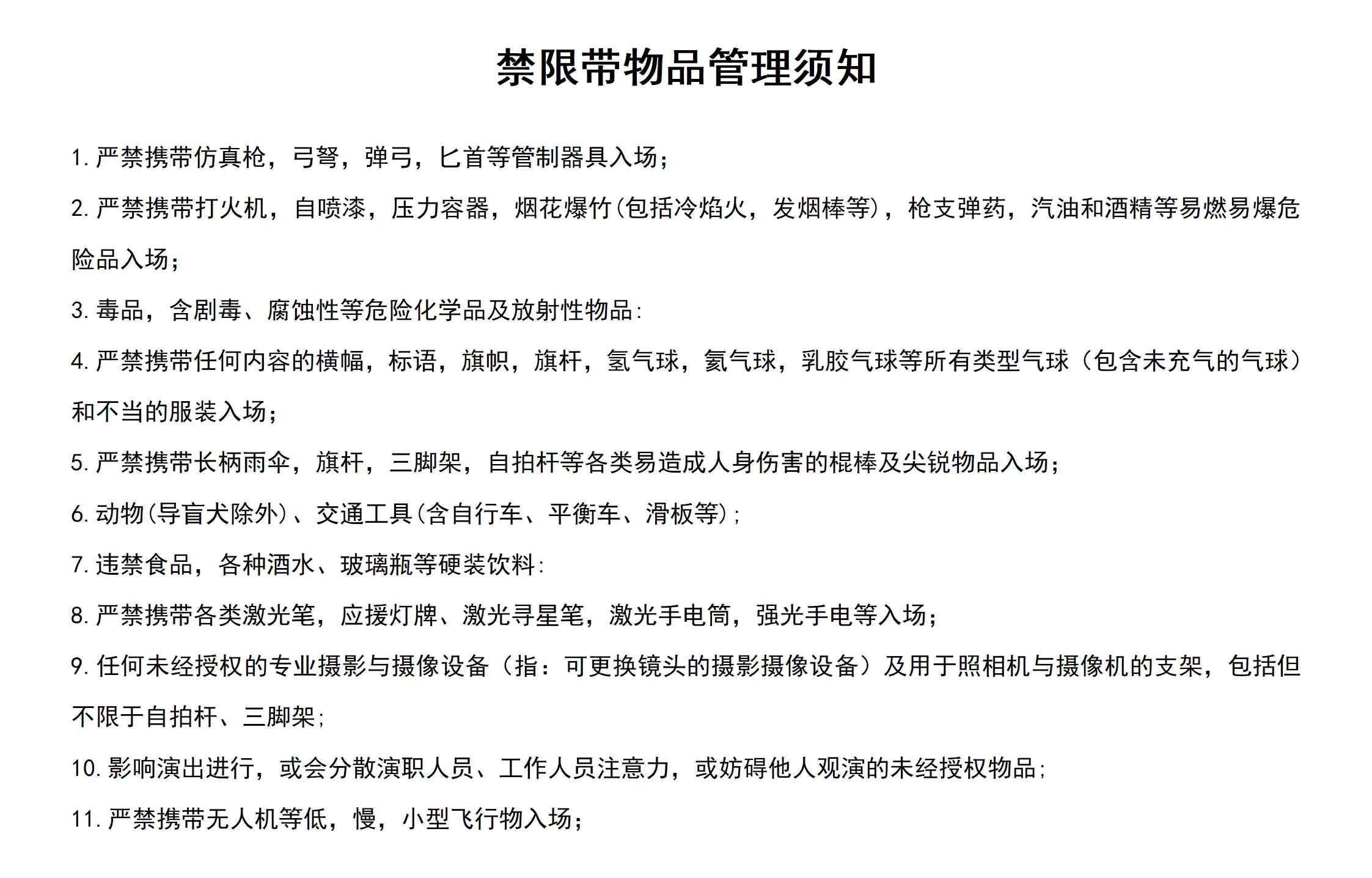 由于安保和版权的原因,大多数演出、展览及比赛场所禁止携带食品、饮料、专业摄录设备、打火机等物品,请您注意现场工作人员和广播的提示,予以配合。