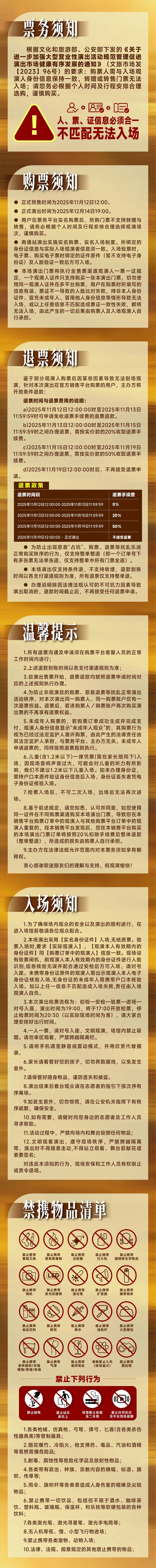1.购买前请您提前规划好行程,做好相应准备,以免影响您的正常观演,感谢您的理解和配合。