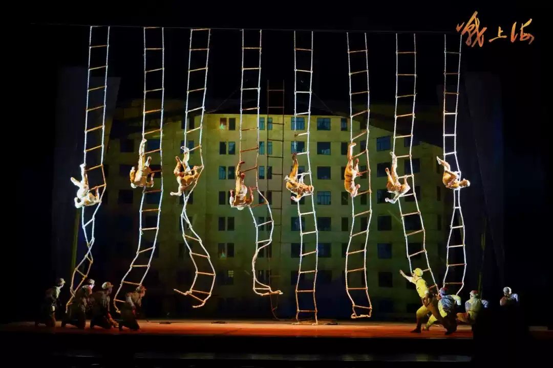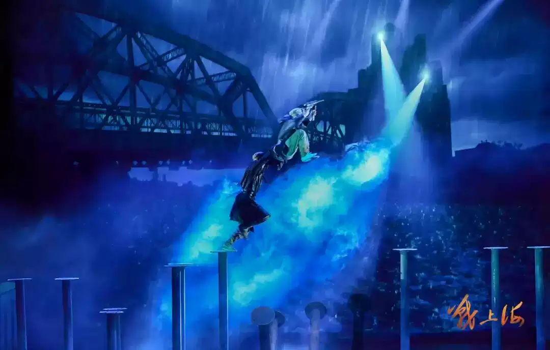 在“雨夜飞渡”篇章,主创以苏州河畔木桩为灵感设计梅花桩道具,演员在桩上攀爬、跳跃,完美还原突击队飞渡苏州河的惊险瞬间;“青春誓约” 中,双人绸吊与多媒体技术结合,将江华与白兰的真挚爱情唯美呈现。惊心动魄的特技展示,搭配真挚细腻的情感表达,让杂技不再只是技巧的展示,更成为推动剧情、传递情感的核心载体。