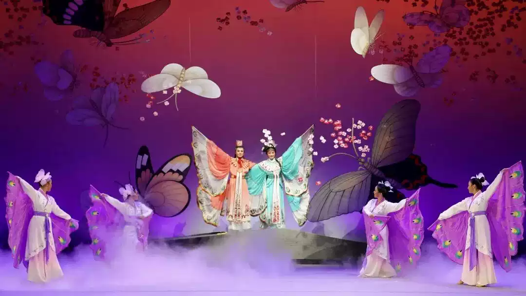 英台闻耗,身穿孝服到山伯坟前祭奠。忽然风雪大作,雷电交加,坟墓绽裂,英台跃入墓中。霎时,“梁祝”化作蝴蝶,翩翩而舞。这曲超越时空的生死恋情的赞歌,为世代传颂。